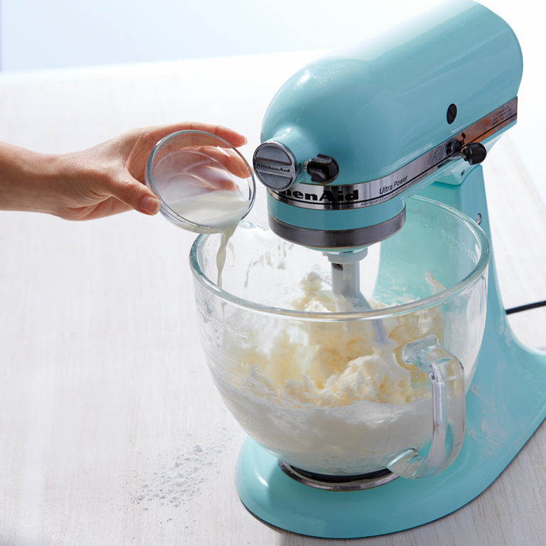 5. While mixer is running, gradually add half the milk or water (with the dissolved salt, if using). Beat at medium speed until light and fluffy.
